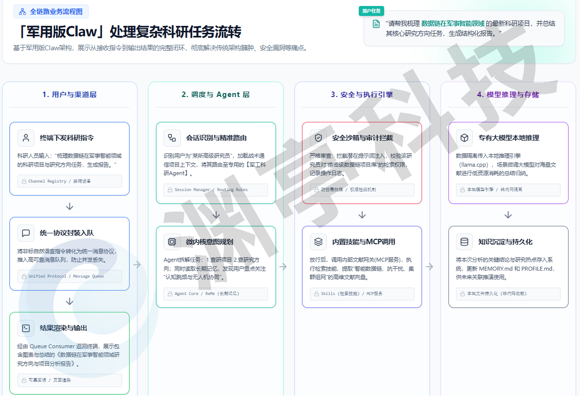类似OpenClaw通用开源AI助手最大的软肋在于其“开放性”不可控,而军用Claw的第一原则就是安全可控。MilClaw核心架构基于渊亭完全自主创新的技术底座构建,从底层逻辑上就切断了“后门”与“隐藏指令”的可能。