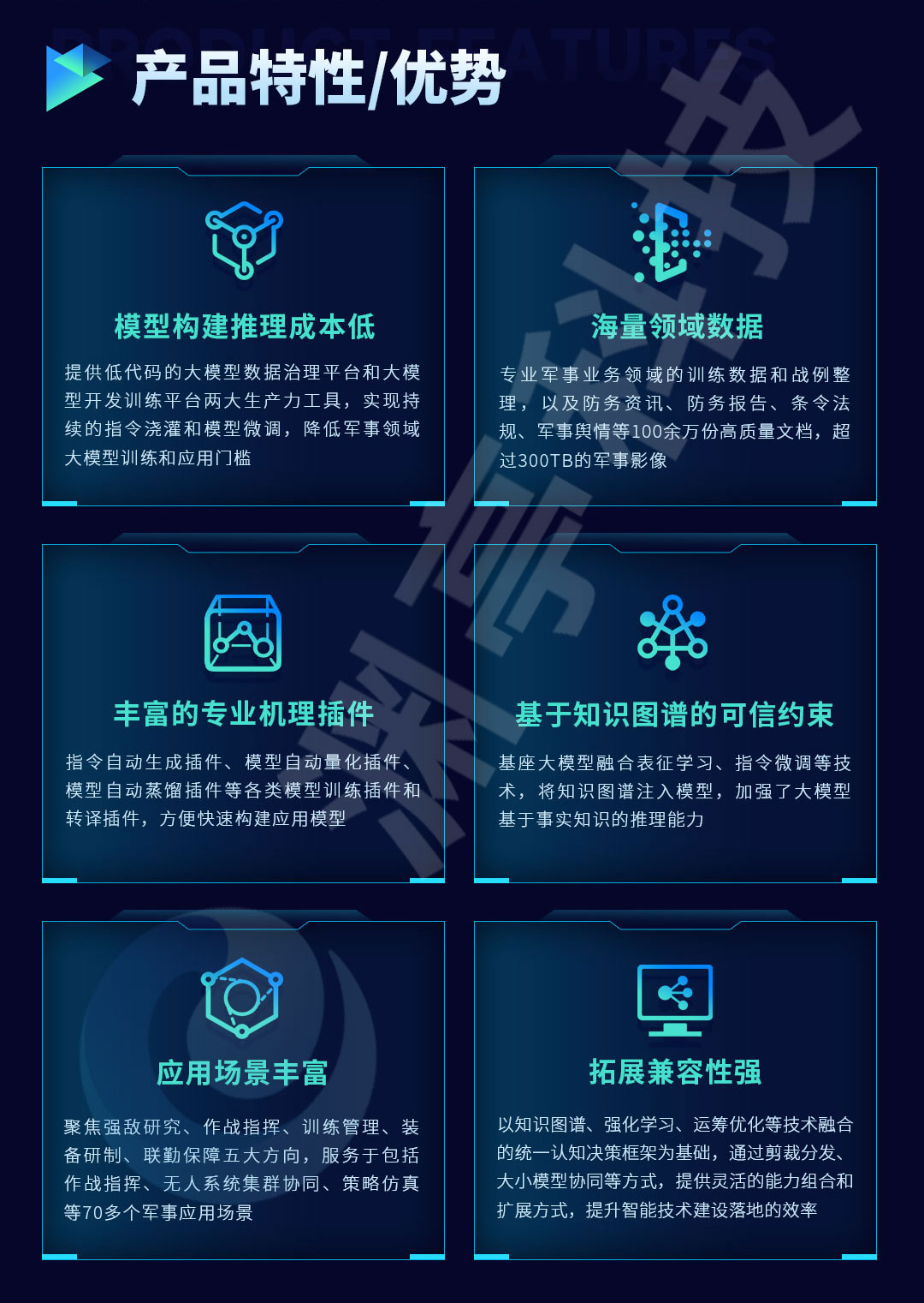 天机·军事大模型具有以下产品优势:模型构建推理成本低、海量领域数据、丰富的专业机理插件、知识图谱的可信约束、应用场景丰富、拓展兼容性强。